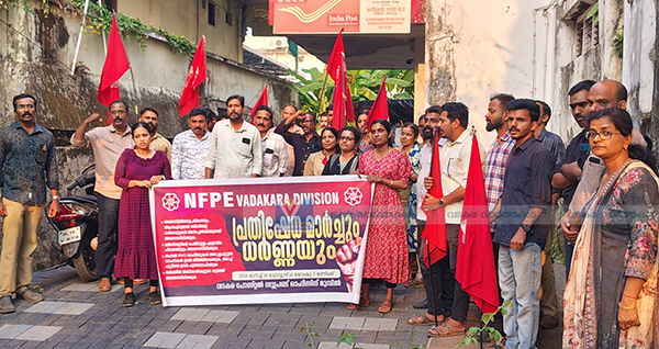 വടകര: വിവിധ ആവശ്യങ്ങള്‍ ഉന്നയിച്ച് സര്‍ക്കിള്‍ പോസ്റ്റല്‍ ജോയിന്റ് കൗണ്‍സില്‍ ഫോര്‍ ആക്ഷന്റെ (എന്‍എഫ്പിഇ) നേതൃത്വത്തില്‍ വടകര പോസ്റ്റല്‍ സൂപ്രണ്ട് ഓഫീസിലേക്ക് പ്രതിഷേധ മാര്‍ച്ചും ധര്‍ണയും നടത്തി. തപാല്‍, ആര്‍എംഎസ് ഓഫീസുകള്‍ അടച്ചുപൂട്ടുന്നത് അവസാനിപ്പിക്കുക, അടച്ചുപൂട്ടിയവ ഉടന്‍ പുനഃസ്ഥാപിക്കുക, അശാസ്ത്രീയ ബിസിനസ്സ് ടാര്‍ഗറ്റുകള്‍ അടിച്ചേല്‍പ്പിക്കുന്നത് നിര്‍ത്തുക, ബിസിനസിന്റെ പേരിലുള്ള എല്ലാവിധ പീഡനങ്ങളും അവസാനിപ്പിക്കുക തുടങ്ങിയ ആവശ്യങ്ങള്‍ ഉന്നയിച്ചാണ് സമരം സംഘടിപ്പിച്ചത്. സര്‍ക്കിള്‍ പോസ്റ്റല്‍ ജോയിന്റ് കൗണ്‍സില്‍ ഫോര്‍ ആക്ഷന്റെ നേതൃത്വത്തില്‍ നടത്തിവരുന്ന നിസ്സഹകരണ സമരം നാലാം ഘട്ടത്തിന്റെ ഭാഗമായി എന്‍എഫ്പിഇ പ്രതിഷേധ മാര്‍ച്ചും ധര്‍ണയും സംഘടിപ്പിച്ചത്. പ്രേമന്‍.പി.കെ, രാഹുല്‍.കെ.ടി, ബാബു പുത്തന്‍ പുരയില്‍, അക്ഷയ്.എസ്, അശ്വന്ത് ചന്ദ്രന്‍ തുടങ്ങിയവര്‍ ധര്‍ണയെ അഭിസംബോധന ചെയ്തു.
